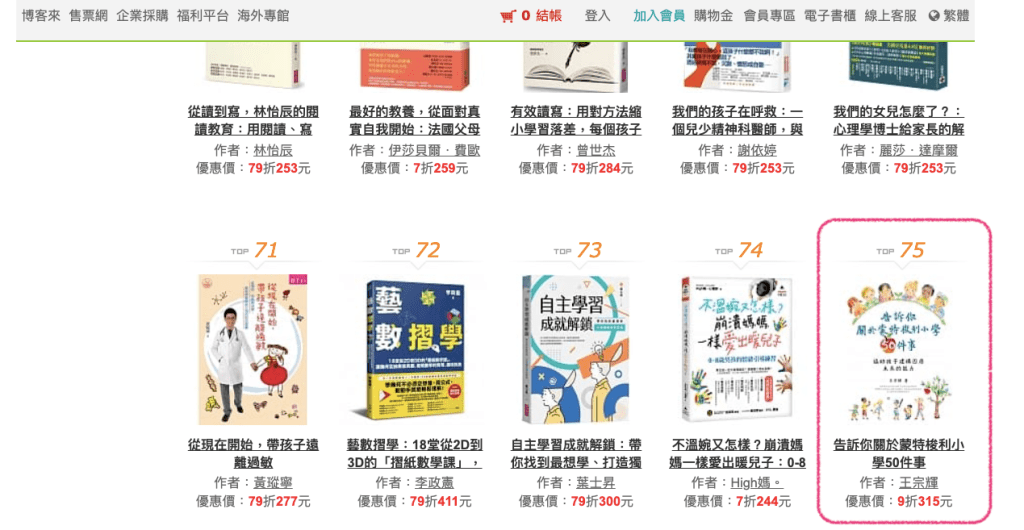 博客來上架兩天的成果,在親子教養類的銷售排名第75名。