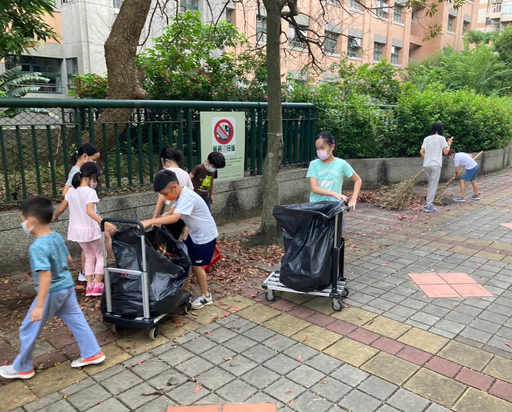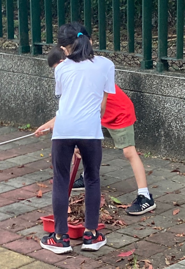 各組自行分工,有的拿竹掃帚清掃落葉、有的拿畚箕、有人負責推垃圾推車,也有低年級的負責撿拾垃圾。